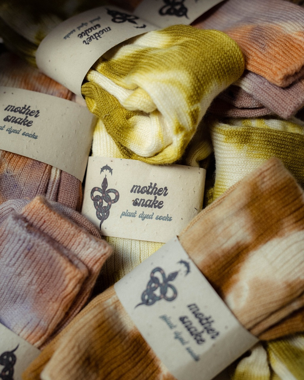 Find handwoven baskets crafted from Salt Spring Island willow and finished with leather handles, alongside soft merino wool socks dyed in vibrant, natural hues—using plants and flowers, many harvested from her own garden.